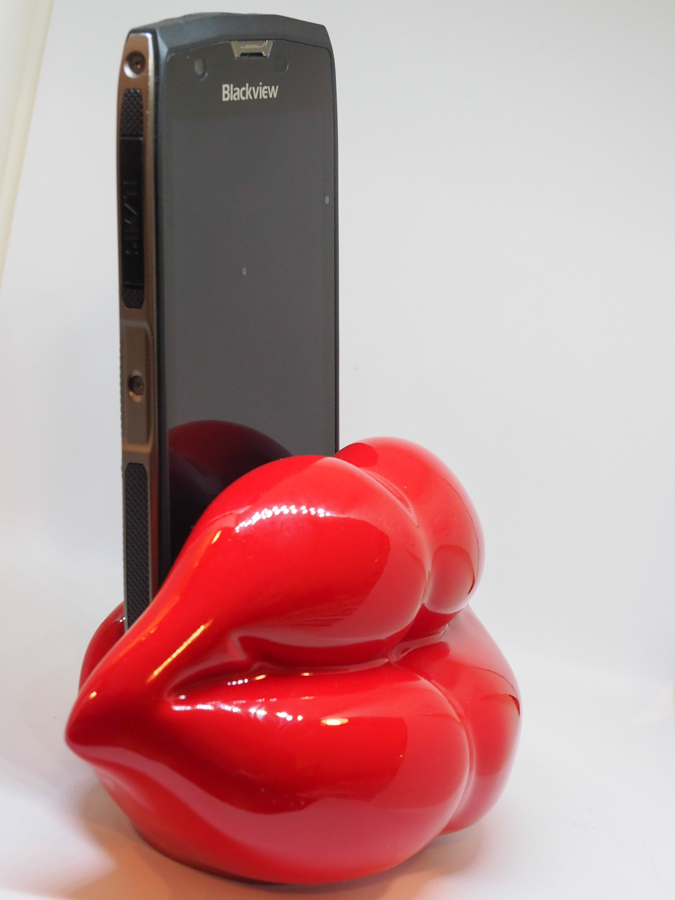 Suport per al telèfon mòbil o la tablet en forma de boca de dona. Fet de resina i acabat a mà