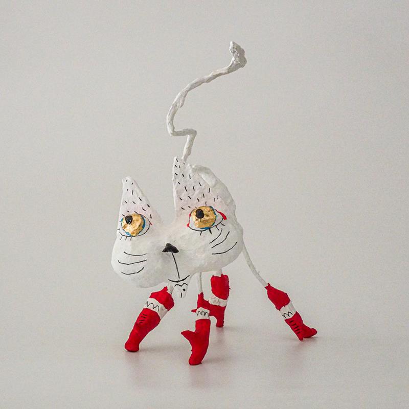 Divertida escultura d'un gat de paper maixé feta artesanalment amb materials de primera qualitat i pintada amb una combinació de tècniques modernes i antigues, com les resines sintètiques sobre una base de creta tradicional o pintura al tremp.