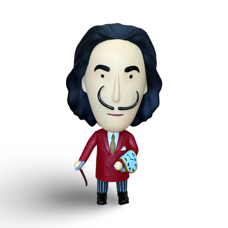 Cute Salvador Dalí doll equipped with numerous accessories including different mustache styles, 5 reproductions of iconic paintings, a walking stick and a soft watch