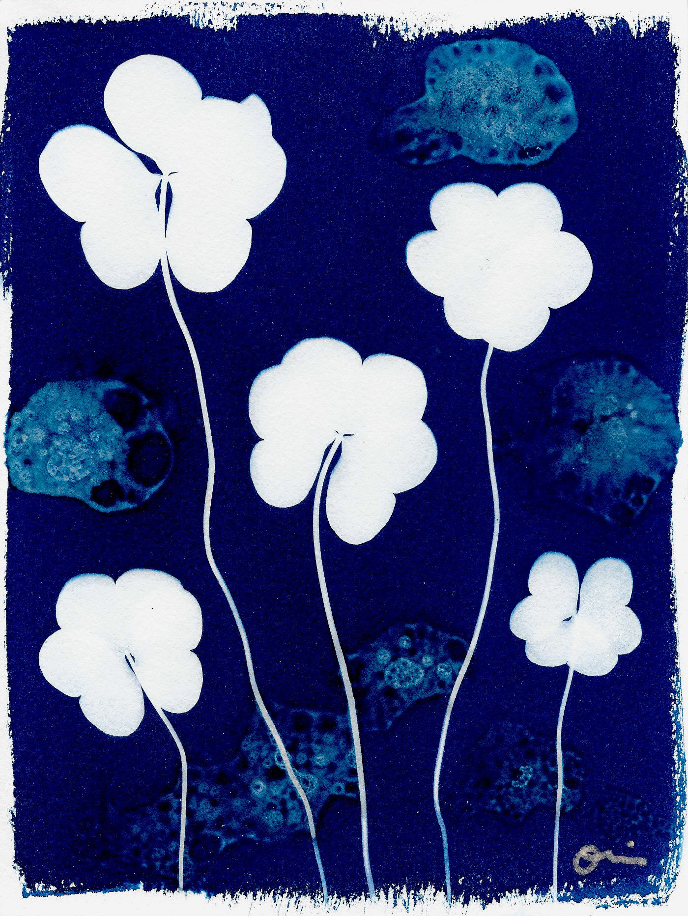 Cyanotype is an ancient photography technique that provides unique images that cannot be repeated. The procedure consists of sensitizing a sheet of paper with a mixture of chemicals, placing the object to be reproduced on it - in this case they are plant motifs - and leaving it for a while to be printed in the sun or in any another source of ultraviolet light. It is then rinsed with water to remove chemical residues and left to dry in a dark place so that the blue color is revealed with all its intensity. The result is a negative image on a background of a blue color, known as Prussian blue.