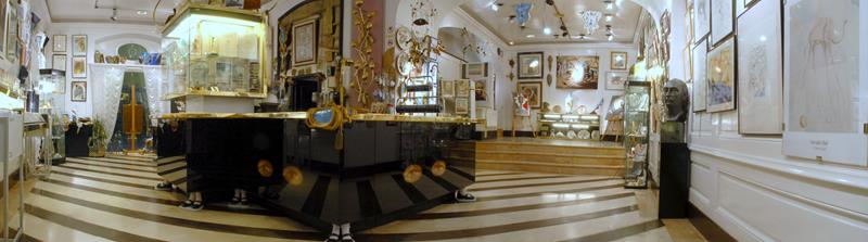 El suelo de la tienda es también una obra de arte, las líneas que combinan mármol y madera acentúan la sensación de perspectiva que tantas veces utilizó Dalí en sus obras.