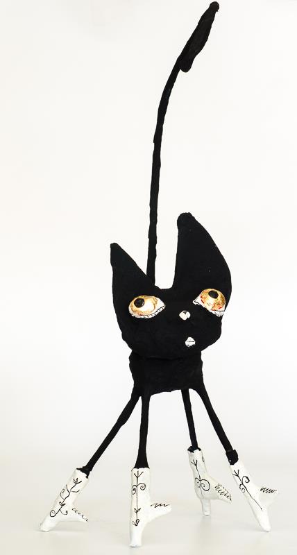 Divertida escultura de un gato de papel maché hecha artesanalmente con materiales de primera calidad y pintada con una combinación de técnicas antiguas y modernas, como las resinas sintéticas sobre una base de creta tradicional o pintura al temple.