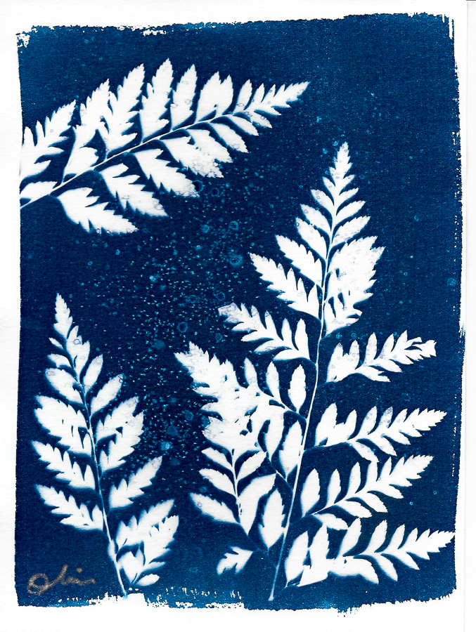 La cianotípia es una técnica de fotografía antigua que proporciona unas imágenes únicas que no pueden volver a repetirse. El procedimiento consiste en sensibilizar una hora de papel con una mezcla de productos químicos, colocar el objeto que se quiere reproducir encima -en este caso son motivos vegetales- y dejarlo un rato para que se impresione con el sol o con cualquier otra fuente de luz ultravioleta. Posteriormente se aclara con agua para eliminar los restos químicos y se deja secar en un lugar oscuro para que se revele el color azul con toda su intensidad. El resultado es una imagen en negativo sobre un fondo de color azul, conocido como azul de Prúsia.