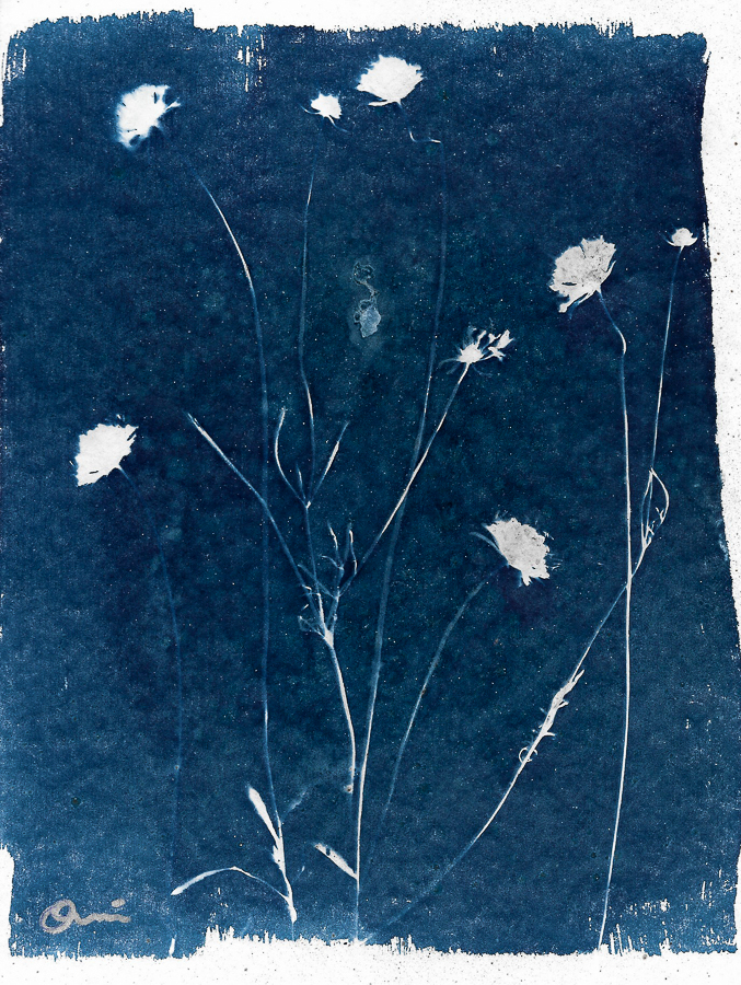 La cianotípia es una técnica de fotografía antigua que proporciona unas imágenes únicas que no pueden volver a repetirse. El procedimiento consiste en sensibilizar una hora de papel con una mezcla de productos químicos, colocar el objeto que se quiere reproducir encima -en este caso son motivos vegetales- y dejarlo un rato para que se impresione con el sol o con cualquier otra fuente de luz ultravioleta. Posteriormente se aclara con agua para eliminar los restos químicos y se deja secar en un lugar oscuro para que se revele el color azul con toda su intensidad. El resultado es una imagen en negativo sobre un fondo de color azul, conocido como azul de Prúsia.