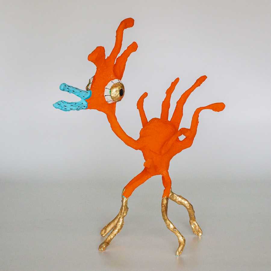 Sculpture amusante d'un paon en papier mâché fabriqué à la main avec des matériaux de première qualité et peint avec une combinaison de techniques anciennes et modernes, telles que les résines synthétiques sur une base à la craie traditionnelle ou sur la peinture à la tempe.