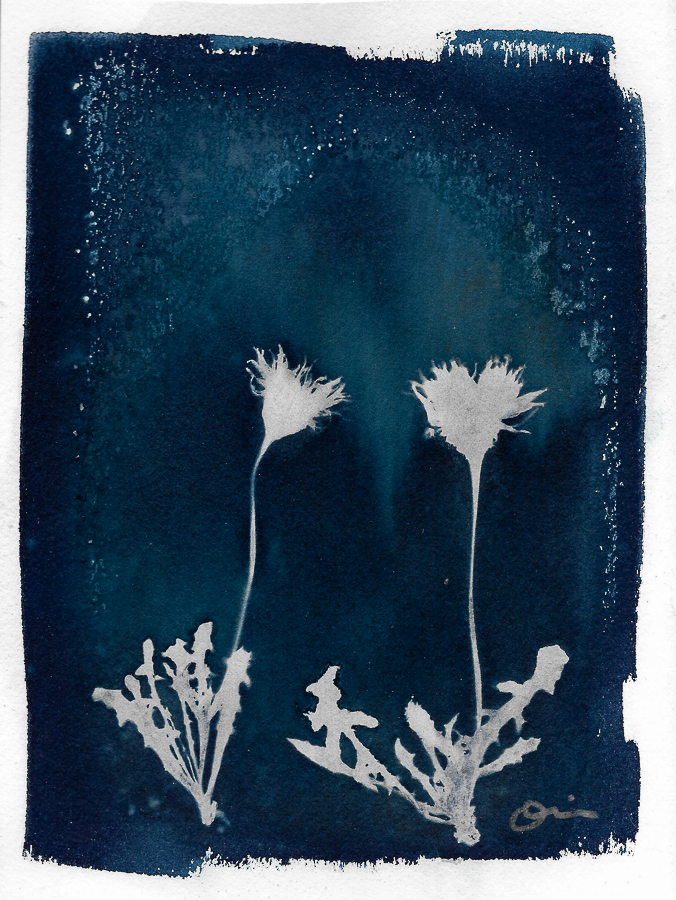 Le cyanotype est une technique de photographie ancienne qui fournit des images uniques qui ne peuvent pas être répétées. La procédure consiste à sensibiliser une feuille de papier avec un mélange de produits chimiques, à placer l'objet à reproduire dessus -dans ce cas, ce sont des motifs végétaux- et à le laisser à imprimer au soleil ou dans n'importe quel une autre source de lumière ultraviolette. Il est ensuite rincé à l'eau pour éliminer les résidus chimiques et laissé sécher dans un endroit sombre pour que la couleur bleue se révèle avec toute son intensité. Le résultat est une image négative sur un fond de couleur bleue, connue sous le nom de bleu de Prusse.